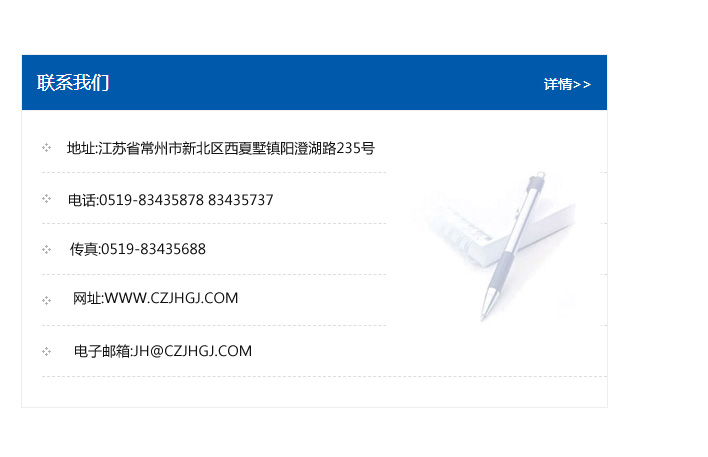 地址:常州市新北區友邦商務大廈1幢16、17層  電話:0519-85101652  傳真:0519-85112595  郵編:213022  網址:www_cz-jiayue_cn.scjyht.com  郵箱:xiajifengaa@163.com